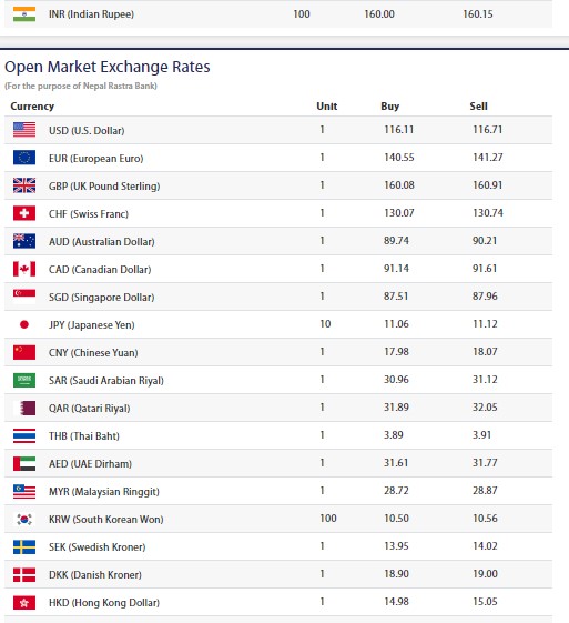 त्यस्तै, यूरोपियन यूरोको खरिददर १ सय ४० रुपैयाँ ५५ पैसा र बिक्रिदर १४१ रुपैयाँ २७ पैसा रहेको छ । यूको पाउन्ड स्टिलिङको खरिददर १ सय ६० रुपैयाँ ८ पैसा र बिक्रिदर १६१ रुपैयाँ ९१ पैसा रहेको छ ।
