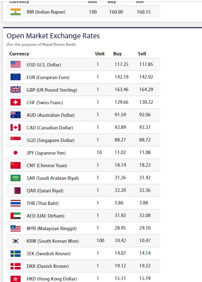 त्यस्तै, यूरोपियन यूरोको खरिददर १ सय ४२ रुपैयाँ १९ पैसा र बिक्रिदर १४२ रुपैयाँ ९२ पैसा रहेको छ । यूको पाउन्ड स्टिलिङको खरिददर १ सय ६३ रुपैयाँ ४६ पैसा र बिक्रिदर १६४ रुपैयाँ २९ पैसा रहेको छ ।
