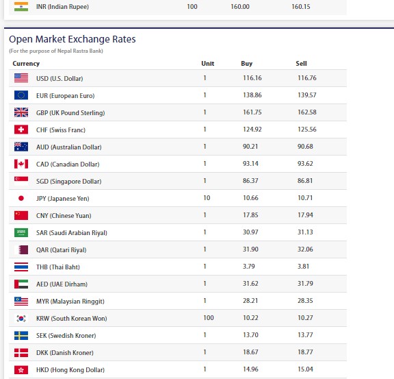 त्यस्तै, यूरोपियन यूरोको खरिददर १ सय ३८ रुपैयाँ ८६ पैसा र बिक्रिदर १३९ रुपैयाँ ५७ पैसा रहेको छ । युरो पाउन्ड स्टिलिङको खरिददर १ सय ६१ रुपैयाँ ७५ पैसा र बिक्रिदर १६२ रुपैयाँ ५८ पैसा रहेको छ ।