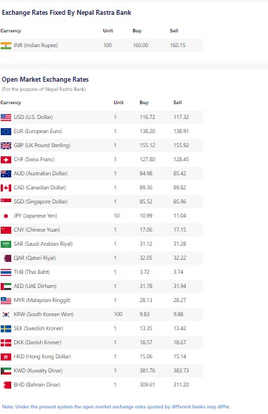 त्यस्तै, एक यूरोपियन यूरोको बिक्रिदर १ सय ३८ रुपैयाँ २० पैसा रहेको छ भने खरिददर १ सय ३८ रुपैयाँ ९१ पैसा रहेको छ । एक यूके पाउन्डको बिक्रिदर १ सय ५५ रुपैयाँ १२ पैसा र खरिददर १ सय ५५ रुपैयाँ ९२ पैसा रहेको छ।