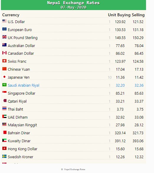 यस्तै, युरोपियन युरो एकको खरिददर १३० रुपैयाँ ५३ पैसा र विक्रिदर १३१ रुपैयाँ १८ पैसा रहेको भने युके पाउन्ड स्ट्रीलिङको खरिददर १ सय ४९ रुपैयाँ ५५ पैसा रहेको छ भने विक्रीदर १५० रुपैयाँ २९ पैसा निधारण गरेको छ ।