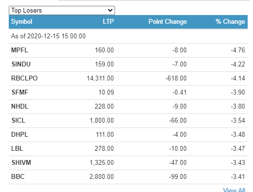 आज सबैभन्दा धेरै मल्टिपर्पोज फाइनान्सका लगानीकर्ताले ४ दशमलव ७४ प्रतिशतका दरले गुमाएका छन् । सिन्धु विकास बैंकका लगानीकर्ताले ४ दशमलव २२ प्रतिशतका दरले गुमाएका छन् ।
