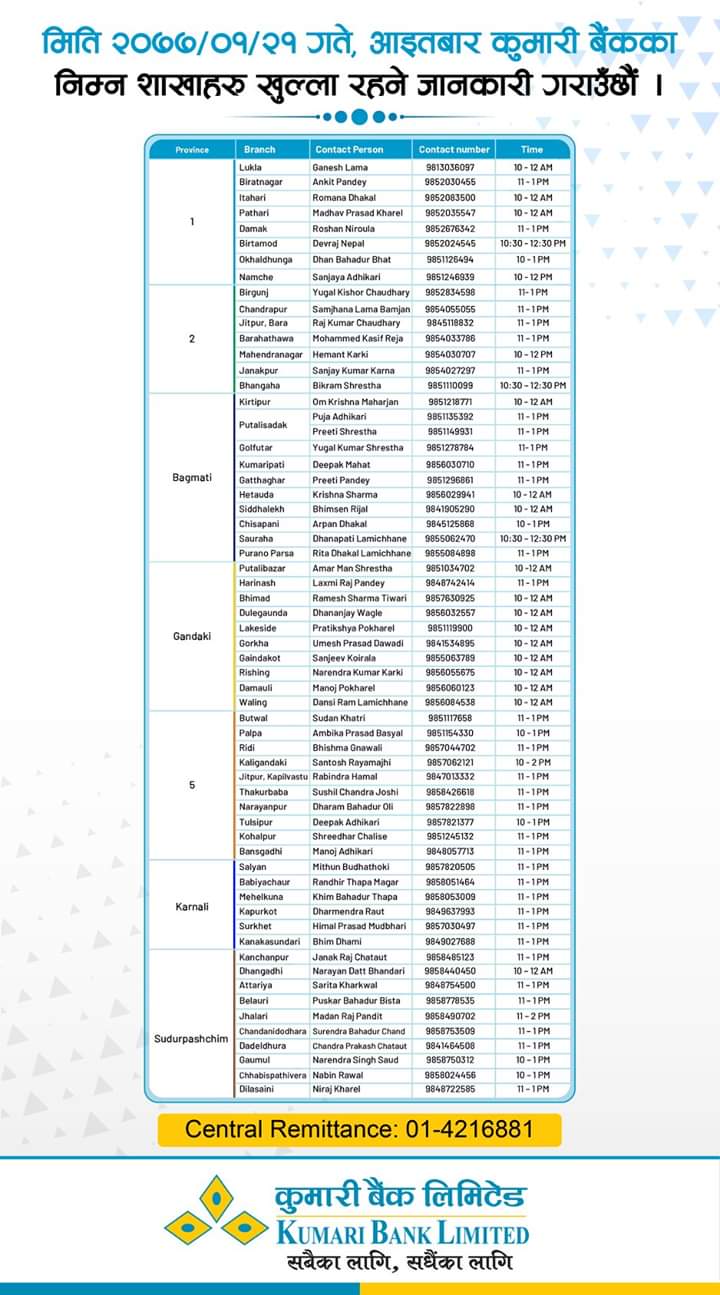 काठमाडौं । आज कुमारी बैंकले उपत्यकाभित्र तथा उपत्यका बाहिरका विभिन्न शाखा कार्यालयबाट सेवा दिने भएको छ । शाखाहरु स्थान अनुसार फरक फरक समयमा खुल्ने बैंकले जनाइएको छ ।
