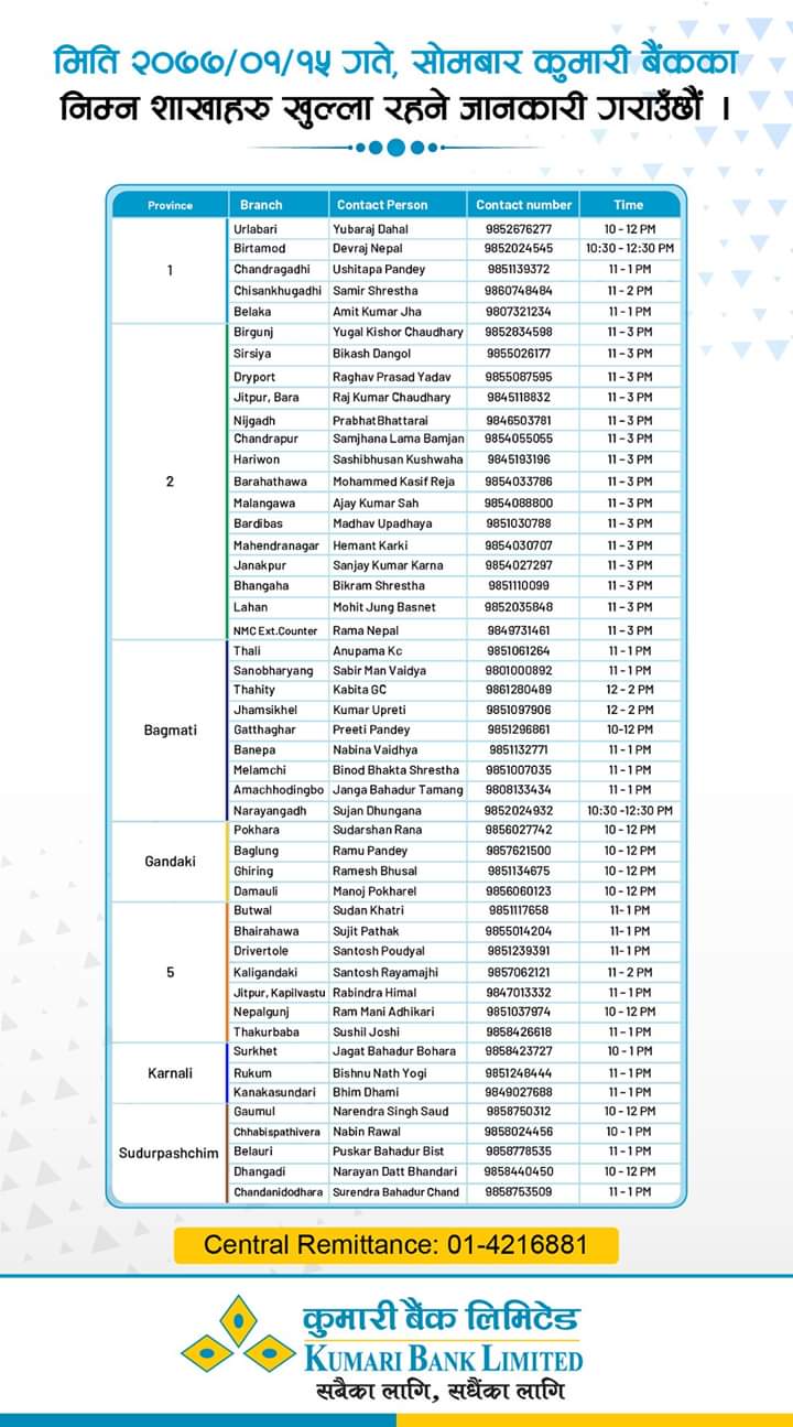 काठमाडौं । काठमाडौं । कुमारी बैंकले आज उपत्यकाभित्र तथा उपत्यका बाहिरका विभिन्न शाखा कार्यालयबाट सेवा दिने भएको छ । बैंकले स्थान अनुसार फरक फरक समयमा आफ्ना शाखा कार्यालय खुला गर्ने भएको छ ।