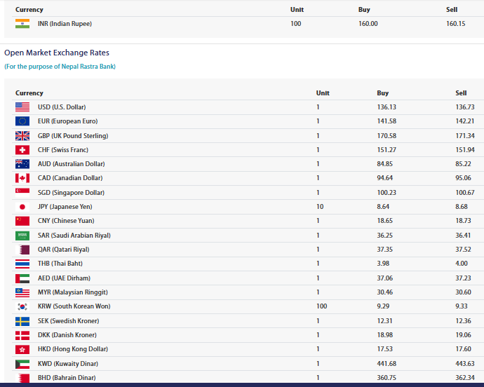 यता, युरोपियन युरो एकको खरिददर एक सय ४१ रुपैयाँ ५८ पैसा र बिक्रीदर एक सय ४२ रुपैयाँ २१ पैसा, युके पाउण्ड स्टर्लिङ एकको खरिददर एक सय ७० रुपैयाँ ५८ पैसा र बिक्रीदर एक सय ७१ रुपैयाँ ३४ पैसा, स्वीस फ्र्याङ्क एकको खरिददर एक सय ५१ रुपैयाँ २७ पैसा र बिक्रीदर एक सय ५१ रुपैयाँ ९४ पैसा कायम गरिएको छ।