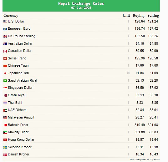 त्यस्तै, युरोपियन युरो एकको खरिददर १३६ रुपैयाँ ७४ पैसा र विक्रिदर १३७ रुपैयाँ ४२ पैसा र युके पाउन्ड स्ट्रिलिङ एकको खरिददर १५२ रुपैयाँ ५० पैसा र बिक्रिदर १५३ रुपैयाँ २६ पैसा रहेको नेपाल राष्ट्र बैंकले जनाएको छ ।