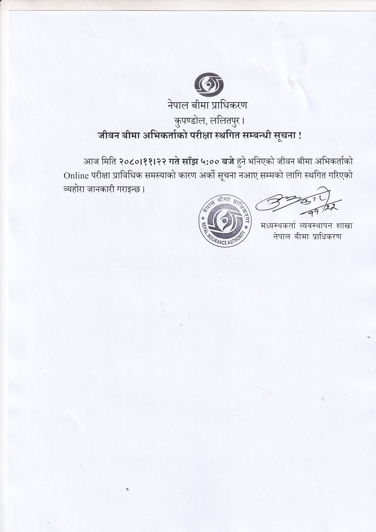 आज दोस्रो सिफ्टको अभिकर्ता अनलाइन परीक्षा स्थगित