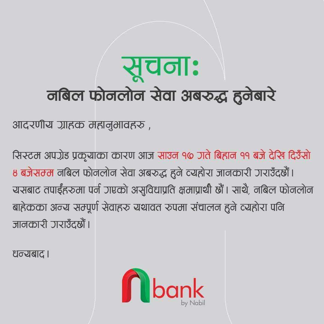 काठमाडौं । नविल फोनलोन सेवा आवरुद्ध हुने भएको छ । नविल बैंकले एक सुचना जारी गर्दै सिस्टम अपग्रेड प्रक्रियाका कारण आज साउन १७ गते विहान ११ बजेदेखि दिउँसो ४ बजेसम्म उक्त सेवा आवरुद्ध हुने जनाएको छ । यसबाट ग्राहकहरुलाई पर्न जाने असुविधाप्रति बैंकले क्षमा मागेको छ । यस फोनलोन बाहेकका अन्य सबै सुविधाहरु यथावत रहेको समेत जनाइएको छ । नविल बैंकले नेपालमै पहिलोपटक फोनलोनको सुविधा ल्याएको हो ।