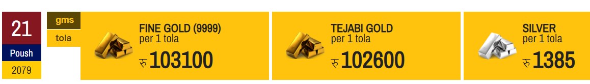 आज तेजाबी सुनको भाउ पनि तोलामा २ सय रुपैयाँले बढेर प्रतितोला १ लाख २ हजार ६ सय रुपैयाँमा कारोबार भइरहेको छ। आज चाँदीको भाउमा भने गिरावट आएको छ। तोलामा १ ५ रुपैयाँले घटेर प्रतितोला १ हजार ३ सय ८५ रुपैयाँमा कारोबार भइरहेको महासंघले जनाएको छ।