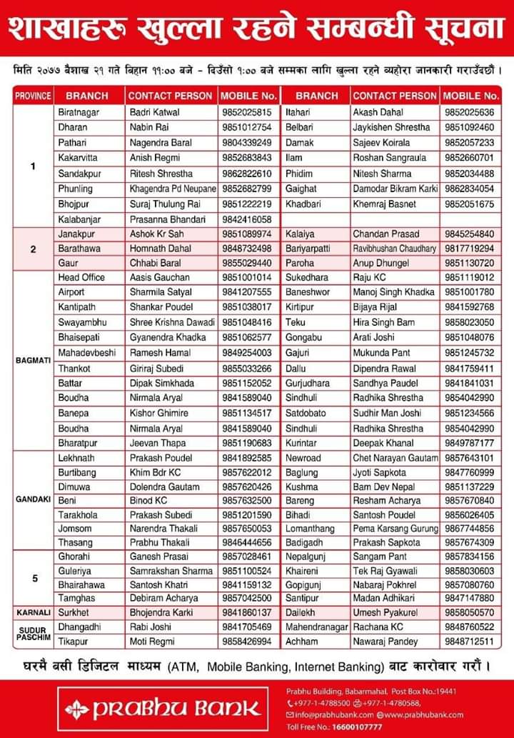 आज प्रभु बैंकले यी शाखा कार्यालय मार्फत सेवा दिने