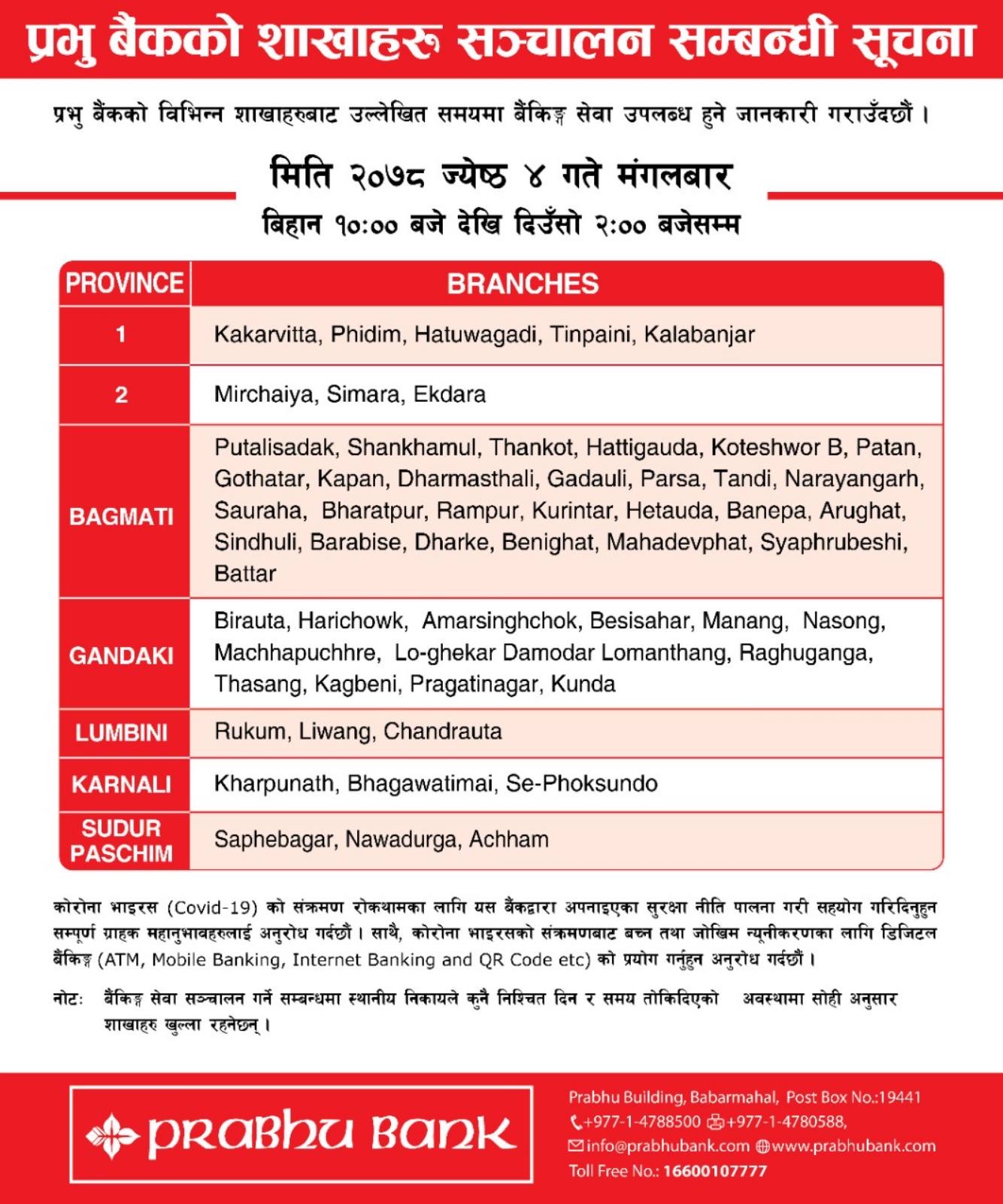 काठमाडौं । आज प्रभु बैंकले उपत्यकाभित्र तथा उपत्यका बाहिरका केही शाखाहरु खुला गरी सेवा दिने भएको छ । कोभिड महामारीको कारणले गर्दा प्रभु बैंकले ग्राहकहरुको सुविधालाई मध्यनजर गर्दै सबै शाखा बन्द नगरी केही शाखा कार्यालय सेवा खुला गरी दिँदै आएको छ । आज जेठ ४ गते बैंकको विभिन्न शाखा कार्यालयहरु विहान ११ बजेदेखि दिउँसो २ बजेसम्मका लागि खुल्ला हुने जानकारी गराइएको छ ।