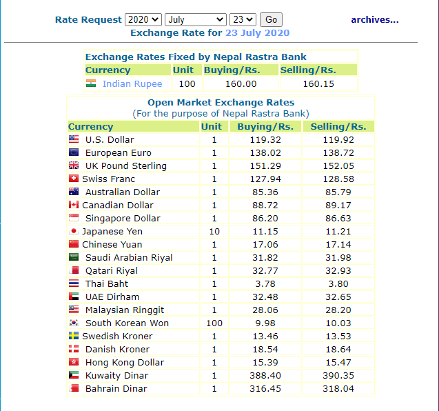 बुधबार केन्द्रीय बैंकले एक अमेरिकी डलरको खरिददर १ सय १९ रुपैयाँ ३१ पैसा र बिक्रीदर १ सय १९ रुपैयाँ ९१ पैसा कायम गरेको थियो ।