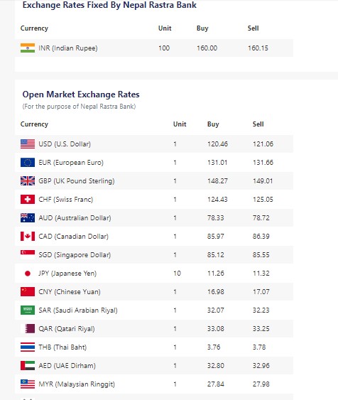 त्यस्तै, युरेपियन यूरोको खरिददर १३१ रुपैयाँ ३ पैसा रहेको छ भने बिक्रिदर १३१ रुपैयाँ ६६ पैसा रहेको छ । युको पाउन्ड स्ट्रीलिङको डलरको खरिददर १४८ रुपैयाँ २७ पैसा बिक्रिदर १४९ रुपैयाँ १ पैसा रहेको छ ।