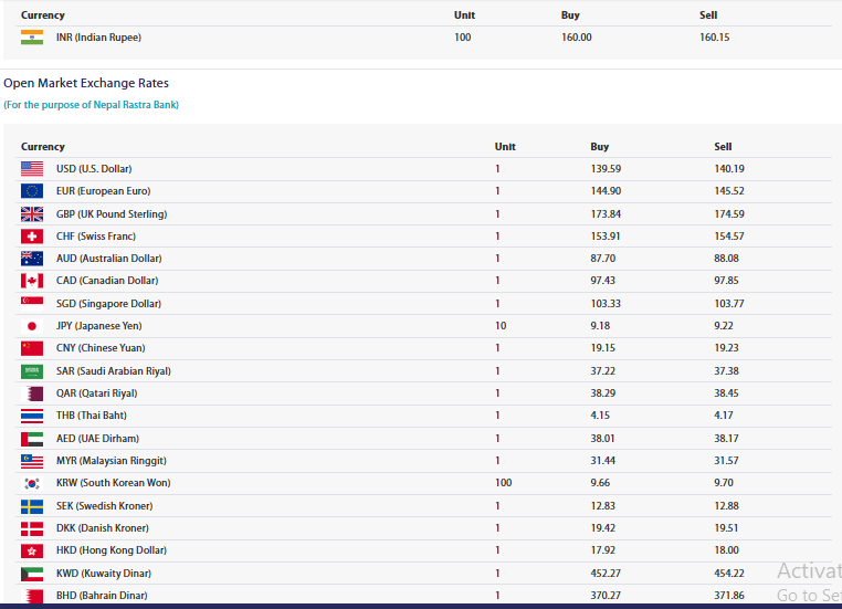 त्यस्तै, युके पाउन्ड स्ट्रलिङ एकको खरिददर १७३ रूपैयाँ ८४ पैसा र बिक्रीदर १७४ रूपैयाँ ५९ पैसा, स्विस फ्र्याङ्क एकको खरिददर १५३ रूपैयाँ ९१ पैसा र बिक्रीदर १५४ रूपैयाँ ५७ पैसा छ।