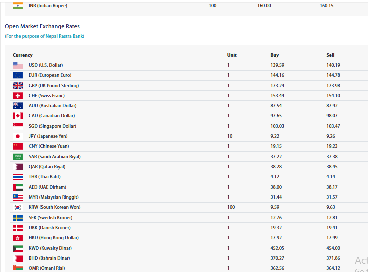 जापानी येन १० को खरिददर नौ रुपैयाँ २२ पैसा र बिक्रीदर नौ रुपैयाँ २६ पैसा, चिनियाँ युआन एकको खरिददर १९ रुपैयाँ १५ पैसा र बिक्रीदर १९ रुपैयाँ २३ पैसा, साउदी अरेबियन रियाल एकको खरिददर ३७ रुपैयाँ २२ पैसा र बिक्रीदर ३७ रुपैयाँ ३८ पैसा, कतारी रियाल एकको खरिददर ३८ रुपैयाँ २८ पैसा र बिक्रीदर ३८ रुपैयाँ ४५ पैसा कायम भएको छ।
