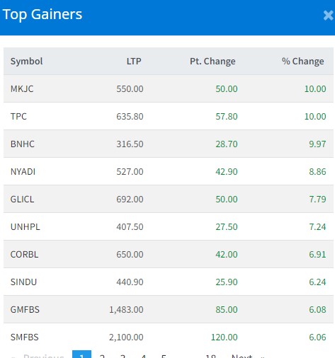 काठमाडौं । आज शेयर बजार नेप्से परिसूचक ३२ दशमलव ९६ अंकले बढेर २,९३१ दशमलव २६ को विन्दुमा कायम भएको छ । आज सबैभन्दा धेरै मैलुङ खोला हाइड्रोपावर कम्पनी र तेह्रथुम पावर कम्पनीका लगानीकर्ताले कमाएका छन् । कम्पनीका लगानकिर्ताले १० प्रतिशतका दरले कमाएका छन् । बुद्धभुमि हाइड्रोपावर कम्पनीका लगानीकर्ताले ९ दशमलव ९७ प्रतिशतका दरले कमाएका छन् । न्यादी हाइड्रोपावर कम्पनीका लगानीकर्ताले ८ प्रतिशतका दरले कमाएका छन् ।