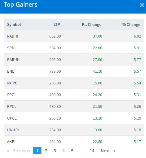 आज सबैभन्दा धेरै राद्यी विद्युत कम्पनीका लगानीकर्ताले कमाएका छन् । कम्पनीका लगानीकर्ताले ६ दशमलव ०२ प्रतिशतका दरले कमाएका छन् । सिनर्जी पावर कम्पनीका लगानीकर्ताले ५ दशमलव ९१ प्रतिशतका दरले कमाएका छन् । बरुण हाइड्रोपावर कम्पनीका लगानीकर्ताले ५ दशलमव ७७ प्रतिशतका दरले कमाएका छन् । इमर्जिङ नेपालका लगानीकर्ताले ५ प्रतिशतका दरले कमाएका छन् ।