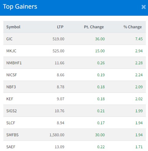 आज सबैभन्दा धेरै जनरल इन्स्योरेन्स कम्पनीका लगानीकर्ताले कमाएका छन् । कम्पनीका लगानीकर्ताले ७ दशमलव ४५ अंकले कमाए हुन् । मैलुङ खोला जलविद्युत कम्पनीका लगानीकर्ताले २ दशमलव ९४ प्रतिशतका दरले कमाएका छन् । एनएमबि हाब्रिट फण्डका इकाईधनीले २ दशमलव २८ प्रतिशतका दरले कमाएका छन् ।