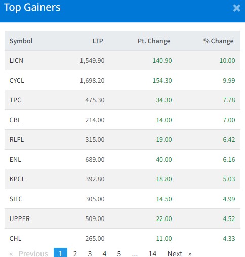 आज सबैभन्दा धेरै एलआइसी नेपालका लगानीकर्ताले कमाएका छन् । कम्पनीका लगानीकर्ताले १० प्रतिशतका दरले कमाएका छन् । सिवाइसी नेपालका लगानीकर्ताले ९ दशमलव ९९ प्रतिशतका दरले कमाएका छन् । तेह्रथुम पावर कम्पनीका लगानीकर्ताले ७ दशमलव ७८ प्रतिशतका दरले कमाएका हुन् । सिभिल बैंकका लगानीकर्ताले ७ प्रतिशतका दरले कमाएका छन् ।