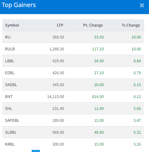 आज सबैभन्दा धेरै रिलायन्स लाइफ र राष्ट्र उत्थान लघुवित्त वित्तीय संस्थाका लगानीकर्ताले कमाएका छन् । कम्पनीका लगानीकर्ताले १० प्रतिशतका दरले कमाएका हुन् । लुम्बिनी विकास बैंकका लगानीकर्ताले ८ दशमलव ८४ प्रतिशतका दरले कमाएका छन् । एक्सेल डेभलपमेन्ट बैंकका लगानीकर्ताले ६ प्रतिशतका दरले कमाएका छन् ।