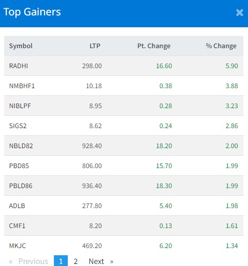आज सबैभन्दा धेरै राद्यी विद्युत कम्पनीका लगानीकर्ताले कमाएका छन् । कम्पनीका लगानीकर्ताले ५ दशमलव ९० प्रतिशतका दरले कमाएका छन् । एनएबि हाइब्रिट फण्ड १ का इकाईधनीले ३ दशमलव ८८ प्रतिशतका दरले कमाएका छन् । एनआइबिएल प्रगति फण्डका इकाईधनीले ३ दशमलव २३ प्रतिशतका दरले कमाएका छन् । आज म्युचुअल फण्डका इकाईधनीले कमाएका छन् ।