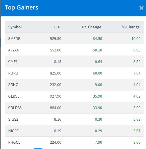 आज सबैभन्दा धेरै समिट लघुवित्त वित्तीय संस्थाका लगानीकर्ताले कमाएका छन् । कम्पनीका लगानीकर्ताले १० प्रतिशतका दरले कमाएका हुन् । अभियान लघुवित्त वित्तीय संस्थाका लगानीकर्ताले ९ दशमलव ९८ प्रतिशतका दरले कमाएका छन् । सिटिजन म्युचुअल फण्ड १ का इकाईधनीले ८ दशमलव ५२ प्रतिशतका दरले कमाएका छन् ।
