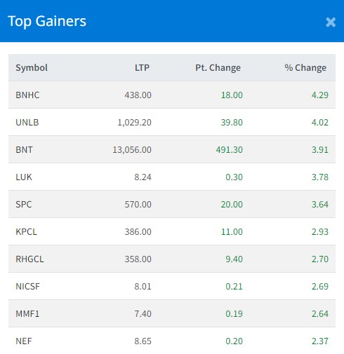 आज सबैभन्दा धेरै बुद्धभुमी नेपालका लगानीकर्ताले कमाएका छन् । यस कम्पनीका लगानीकर्ताले ४ दशमलव २९ प्रतिशतका दरले कमाएका छन् । यूनिक नेपाल लघुवित्तका लगानकिर्ताले ४ दशलमव ०२ प्रशिततका दरले कमाएका छन् । बोटलर्स नेपालका लगानीकर्ताले ३ दशमलव ९१ प्रतिशतका दरले कमाएका छन् ।