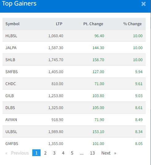 आज सबैभन्दा धेरै हिमालयन लघुवित्त वित्तीय संस्था, जाल्पा लघुवित्त वित्तीय संस्था र सृजनशिल लघुवित्तका लगानीकर्ताले कमाएका छन् । यी ३ कम्पनीका लगानीकर्ताले १० प्रतिशतका दरले कमाएका छन् । स्वाभिमान लघुवित्त वित्तीय संस्थाका लगानीकर्ताले ९ दशमलव ९४ प्रतिशतका दरले कमाएका छन् । सिइडिबी हाइड्रोका लगानीकर्ताले पनि ९ प्रतिशतका दरले कमाएको छन् ।