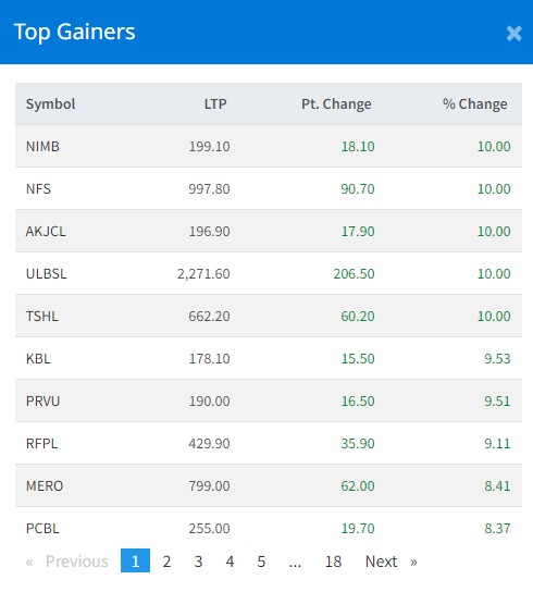 आज सबैभन्दा धेरै नेपाल इन्भेष्टमेन्ट मेगा बैंक, आँखुलोला जलविद्युत, नेपाल फाइनान्स,उपकार लघुवित्त र थ्री स्टार हाइड्रोका लगानीकर्ताले कमाएका छन् । आज यी पाँच कम्पनीका लगानीकर्ताले १० प्रतिशतका दरले कमाएका छन् ।