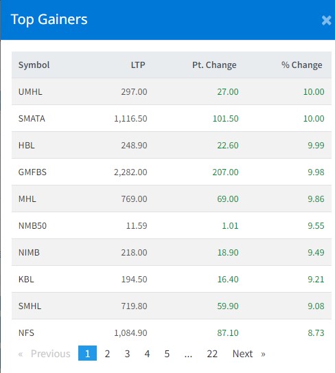 आज सबैभन्दा धेरै यूनाइटेड मोदी र समता घरेलु लघुवित्त वित्तीय संस्थाका लगानीकर्ताले कमाएका छन् । आज यी दुई कम्पनीका लगानीकर्ताले १० प्रतिशतका दरले कमाएका छन् । हिमालयन बैंकका लगानीकर्ताले ९ दशलमव ९९ प्रतिशतका दरले कमाएका छन् । गणपति लघुवित्तका लगानीकर्ताले ९ दशलमव ९८ प्रतिशतका दरले कमाएका छन् ।