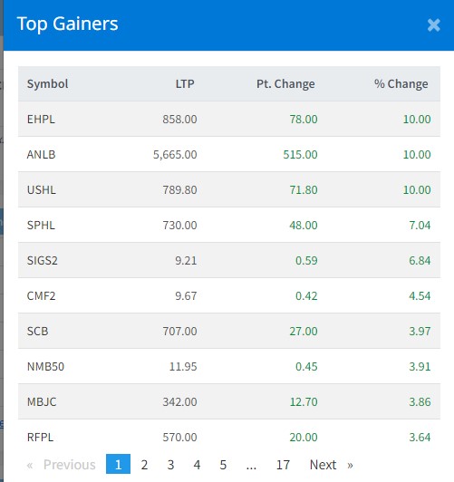 काठमाडौं । आज शेयर बजार दोहोरो बढेर बन्द भएको छ । आज शेयर बजार नेप्से पसरिसूचक ११ दशलमव ५८ अंकले बढेर २,५८८ को विन्दुमा कायम भएको छ । आज १३८ कम्पनीको शेयर मूल्य बढेको छ भने ९४ कम्पनीको शेयर मूल्य घटेको छ । आज सबैभन्दा धेरै इस्र्टन हाइड्रोपावर, आत्मानिर्भर लघुवित्त वित्तीय संस्था र अपर स्यांगे हाइड्रोका लगानीकर्ताले कमाएका छन् । आज यी ३ कम्पनीका लगानीकर्ताले १० प्रतिशतका दरले कमाएका हुन् । सयपत्री हाइड्रोपावरका लगानीकर्ताले ७ प्रतिशतका दरले कमाएका छन् ।