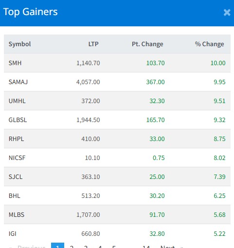 आज सबैभन्दा धेरै सुपरमाइ हाइड्रोपावरका लगानीकर्ताले कमाएका छन् । आज यस कम्पनीका लगानीकर्ताले १० प्रतिशतका दरले कमाएका छन् । समाज लघुवित्तका लगानीकर्ताले ९ दशलमव ९५ प्रतिशतका दरले कमाएका छन् । यूनाइटेड मोदीका लगानीकर्ताले ९ दशलमव ५१ प्रतिशतका दरले कमाएका छन् ।