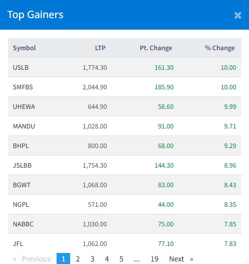 आज सबैभन्दा धेरै उन्नती सहकार्य लघुवित्त र स्वाभिमान लघुवित्त वित्तीय संस्थाका लगानीकर्ताले कमाएका छन् । आज यी दुई कम्पनीका लगानीकर्ताले १० प्रतिशतका दरले कमाएका हुन् । अपर हेवाखोला हाइड्रोका लगानकिर्ताले ९ दशलमव ९९ प्रतिशतका दरले कमाएका छन् । माण्डु हाइड्रोका लगानीकर्ताले ९ दशलमव ७१ प्रतिशतका दरले कमाएका छन् ।