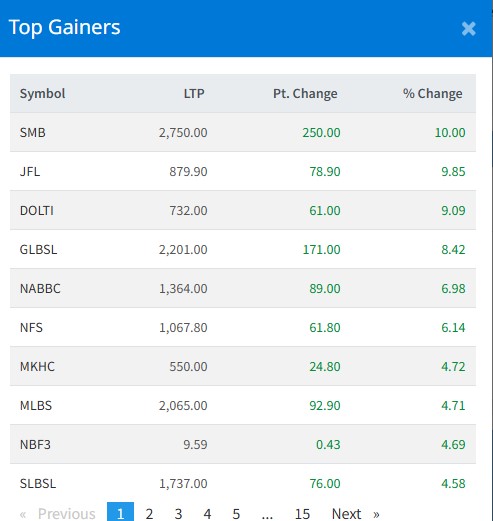 आज सबैभन्दा धेरै सपोर्ट माइक्रोफाइनान्सका लगानीकर्ताले कमाएका छन् । आज यस कम्पनीका लगानीकर्ताले १० प्रतिशतका दरले कमाएका हुन् । जानकी फाइनान्सका लगानीकर्ताले ९ दशलमव ८५ प्रतिशतका दरले कमाएका छन् । दोल्ती पावरका लगानीकर्ताले ९ प्रतिशतका दरले कमाएका छन् ।