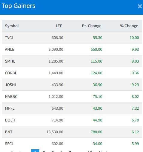 आज सबैभन्दा धेरै त्रिशुली जलविद्युत कम्पनीका लगानीकर्ताले कमाएका छन् । आज यस कम्पनीका लगानीकर्ताले १० प्रतिशतका दरले कमाएका हुन् । आत्मानिर्भर लघुवित्त वित्तीय संस्थाका लगानीकर्ताले ९ दशलमव ९३ प्रतिशतका दरले कमाएका छन् । सुपर मादी हाइड्रोका लगानीकर्ताले ९ दशलमव ८३ प्रतिशतका दरले कमाएका छन् ।