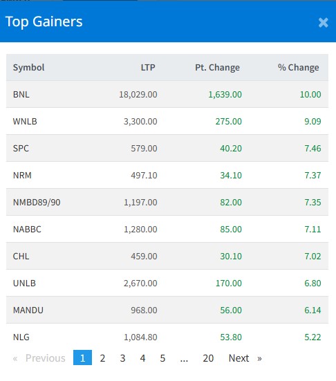 आज सबैभन्दा धेरै बोटलर्स नेपाल बालाजूका लगानीकर्ताले कमाएका छन् । आज यस कम्पनीका लगानीकर्ताले १० प्रतिशतका दरले कमाएका छन् । विन नेपाल लघुवित्त वित्तीय संस्थाका लगानीकर्ताले ९ दशलमव ०९ प्रतिशतका दरले कमाएका छन् । सामलिङ पावरका लगानीकर्ताले ७ दशलमव ४६ प्रतिशतका दरले कमाएका छन् । नेपाल रिपब्लिक मिडियाका लगानीकर्ताले ७ दशलमव ३७ प्रतिशतका दरले कमाएका छन् ।