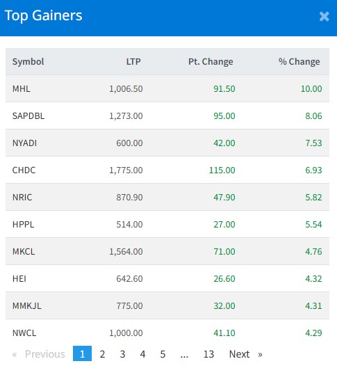 आज सबैभन्दा धेरै मन्दकीनि हाइड्रोपावर कम्पनीको शेयरमा सकारात्मक सर्किट लागेको छ । आज यस कम्पनीका लगानीकर्ताले १० प्रतिशतका दरले कमाएका छन् । सप्तकोशी डेभलपमेन्ट बैंकका लगानीकर्ताले ८ दशलमव ०६ प्रतिशतका दरले कमाएका छन् । न्यादी हाइड्रोका लगानीकर्ताले ७ दशलमव ५३ प्रतिशतका दरले कमाएका छन् । सीएचडीसीका लगानीकर्ताले ६ दशलमव ९३ प्रतिशतका दरले कमाएका छन् ।