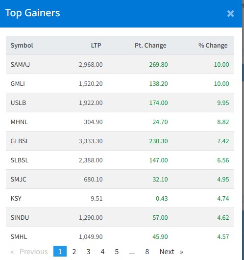 काठमाडौं । आज शेयर बजार नेप्से परिसूचक २५ दशलमव १६ अंकले घटेर २,८२१ को विन्दुमा कायम भएको छ । आज ६२ कम्पनीको शेयर मूल्य बढेको छ भने १७४ कम्पनीको शेयर भाउ घटेको छ । आज सबैभन्दा धेरै समाज लघुवित्त वित्तीय संस्था र गार्डियन माइक्रो लाइफका लगानीकर्ताले कमाएका छन् । आज यी २ कम्पनीका लगानीकर्ताले १० प्रतिशतका दरले कमाएका हुन् । उन्नती सहकार्य लघुवित्तका लगानीकर्ताले ९ दशलमव ९५ प्रतिशतका दरले कमाएका छन् ।