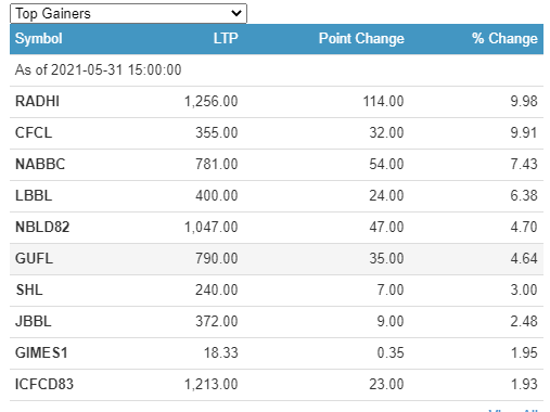 आज सबैभन्दा धेरै राधी विद्युत कम्पनीका लगानीकर्ताले कमाएका छन् । कम्पनीका लगानीकर्ता ९ दशमलव ९८ प्रतिशतका दरले कमाएका छन् । सेन्ट्रल फाइनान्सका लगानीकर्ताले ९ दशमलव ९१ प्रतिशतका दरले कमाएका छन् । नारायणी डेभलपमेन्ट बैंकका लगानीकर्ताले ७ दशमलव ४३ प्रतिशतका दरले कमाएका छन् ।