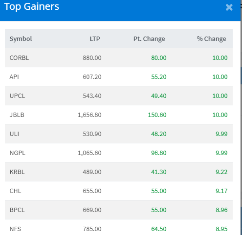 आज सबैभन्दा धेरै कर्पोरेट डेभलपमेन्ट बैंक, अपि पावर कम्पनी, युनिभर्सल पावर कम्पनी, जीवन विकास लघुवित्तका लगानीकर्ताले कमाएका छन् । कम्पनीका लगानीकर्ताले १० प्रतिशतका दरले कमाएका छन् । त्यस्तै, यूनियन लाइफ इन्स्योरेन्स कम्पनीका लगानीकर्ताले ९ दशमलव ९९ प्रतिशतका दरले कमाएका छन् ।