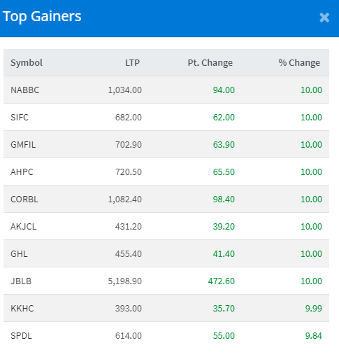 आज १४ कम्पनीको शेयर मुल्यमा सकारात्मक सर्किट लागेको छ । आज नारायणी डेभलपमेन्ट बैंक, श्री इन्भेष्टमेन्ट फाइनान्स, गुह्ेश्वरी मर्चेन्ट बैंकिङ, अरुण भ्याली हाइड्रोपावर कम्पनी, कपोैरेट डेभलपमेन्ट बैंक, आँखु खोला जलविद्युत कम्पनी, घलेम्दी हाइड्रोपावर कम्पनी र जीवन विकास लघुवित्तका लगानीकर्ताले १० प्रतिशतका दरले कमाएका छन् ।