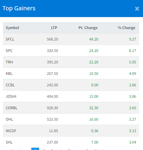 आज सबैभन्दा धेरै समृद्धि फाइनान्स कम्पनीका लगानीकर्ताले कमाएका छन् । कम्पनीका लगानीकर्ताले ९ दशमलव २७ प्रतिशतका दरले कमाएका छन् । सामलिङ पावर कम्पनीका लगानीकर्ताले ८ दशमलव १७ प्रतिशतका दरले कमाएका छन् । तेहूथुम पावर कम्पनीका लगानीकर्ताले ५ दशमलव ९५ प्रतिशतका दरले कमाएका छन् । कुमारी बैंकका लगानीकर्ताले ४ प्रतिशतका दरले कमाएका छन् ।