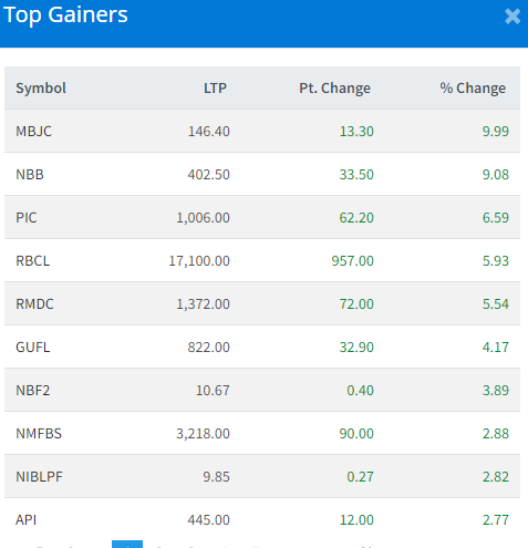 आज सबैभन्दा धेरै मध्यभोटेकोशीका लगानीकर्ताले कमाएका छन् । कम्पनीका लगानीकर्ताले ९ दशमलव ९९ प्रतिशतका दरले कमाएका हुन् । नेपाल बङलादेश बैंकका लगानीकर्ताले ९ दशमलव ०८ प्रतिशतका दरले कमाएका छन् । प्रिमियर इन्स्योरेन्स कम्पनीका लगानीकर्ताले ६ प्रतिशतका दरले कमाएका छन् । राष्ट्रिय बीमा कम्पनीका लगानीकर्ताले ५ प्रतिशतका दरले कमाएका छन् ।