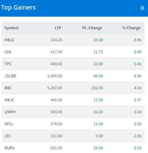 आज सबैभन्दा धेरै मध्य भोटेकोशीका लगानीकर्ताले कमाएका छन् । कम्पनीका लगानीकर्ताले ९ दशमलव ९६ प्रतिशतका दरले कमाएका छन् । छ्याङदी हाइड्रोपावर कम्पनी र तेह्रथुम पावर कम्पनीका लगानीकर्ताले ५ प्रतिशतका दरले कमाएका छन् । जनउत्थान सामुदायिक लघुवित्तका लगानीकर्ताले ४ प्रतिशतका दरले कमाएका छन् ।