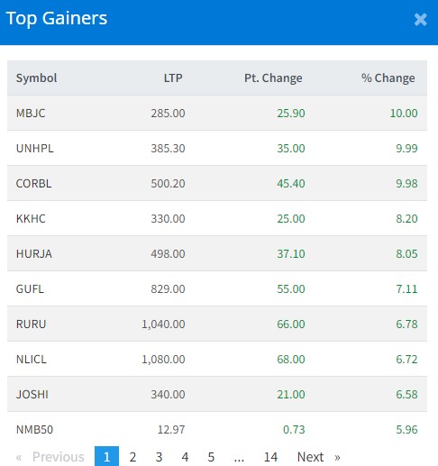 आज सबैभनदा धेरै मध्यभोटेकोशीका लगानीकर्ताले कमाएका छन् । कम्पनीका लगानीकर्ताले १० प्रतिशतका दरले कमाएका हुन् । यूनियन हाइड्रोपावर कम्पनीका लगानीकर्ताले ९ दशमलव ९९ प्रतिशतका दरले कमाएका छन् । कर्पोरेट डेभलपमेन्ट बैंकका लगानीकर्ताले ९ दशमलव ९८ प्रतिशतका दरले कमाएका छन् । खानीखोला हाइड्रोपावर कम्पनीका लगानीकर्ताले ८ प्रतिशतका दरले कमाएका छन् ।