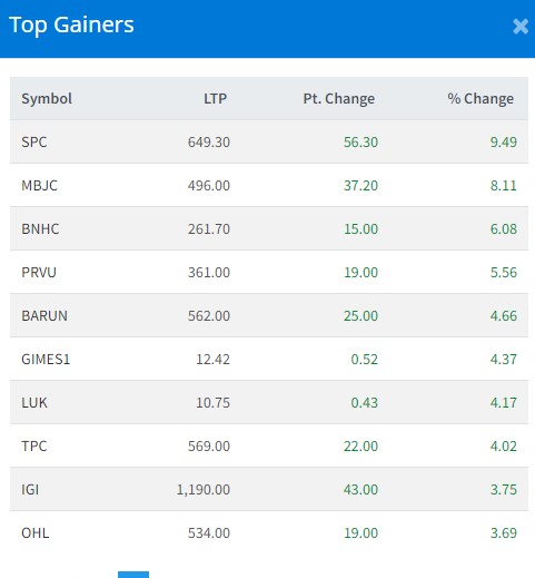 काठमाडौं । आज शेयर बजार नेप्से परिसूचक १० दशमलव ७८ अंकले घटेको छ । आज सबैभन्दा धेरै सामलिङ पावर कम्पनीका लगानीकर्ताले कमाएका छन् । कम्पनीका लगानीकर्ताले ९ दशमलव ४९ प्रतिशतका दरले कमाएका छन् । मध्यभोटेकोशीका लगानीकर्ताले ८ दशमलव प्रतिशतका दरले कमाएका छन् । बद्धभुमि हाइड्रोपावर कम्पनीका लगानीकर्ताले ६ प्रतिशतका दरले कमाएका छन् ।