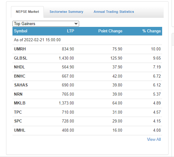 त्यस्तै गुराँस लघुवित्त वित्तीय संस्थाका शेयरधनीहरुले ९.६५ प्रतिशतले आफ्नो पोर्टफेलियो सुधार गरेका छन् । कम्पनीको शेयर मूल्य १२५ रुपैयाँले बढेर १४३० रुपैयाँ कायम भएको छ । नेपाल हाइड्रो डेभलपरका शेयरधनीले ७.१९ प्रतिशतले कमाएका छन् । कम्पनीको शेयर मूल्य ३७ रुपैयाँले बढेर ५६४ रुपैयाँ कायम भएको छ ।