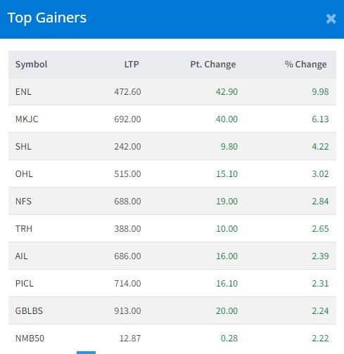 काठमाडौं । आज शेयर बजार नेप्से परिसूचक १९ दशमलव ७४ अंकले घटेर २,६३१ दशमलव ३२ को विन्दुमा कायम भएको छ । आज सबैभन्दा धेरै इमर्जिङ नेपालका लगानीकर्ताले कमाएका छन् । कम्पनीका लगानीकर्ताले ९ दशमलव ९८ प्रतिशतका दरले कमाएका छन् । मैलुङ खोला जलविद्युत कम्पनीका लगानकिर्ताले ६ दशमलव १३ प्रतिशतका दरले कमाएका छन् । सोल्टी होटलका लगानकिर्ताले ४ दशमलव २२ प्रतिशतका दरले कमाएका छन् । ओरिएण्टल होटलका लगानीकर्ताले ३ प्रशिततका दरले कमाएका छन् ।
