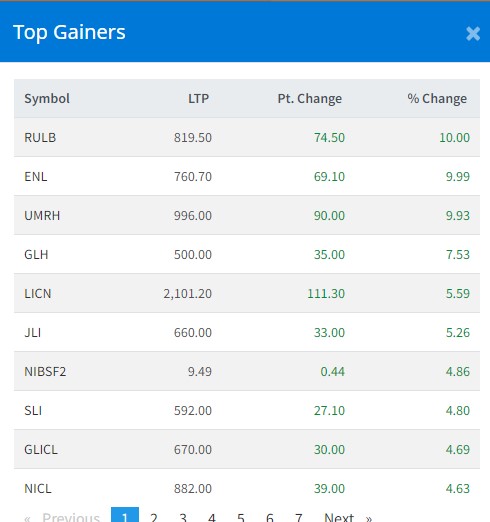 आज सबैभन्दा धेरै राष्ट्र उत्थान लघुवित्तका लगानकिर्ताले कमाएका छन् । कम्पनीका लगानकिर्ताले १० प्रशिततका दरले कमाएका छन् । इमर्जिङ नेपालका लगानीकर्ताले ९ दशमलव ९९ प्रतिशतका दरले कमाएका छन् । यूनाइटेड इदी मर्दिका लगानीकर्ताले ९ दशमलव ९३ प्रतिशतका दरले कमाएका छन् । ग्रिन लाइफ हाइड्रोपावर कम्पनीका लगानीकर्ताले ७ दशलमव ५३ प्रतिशतका दरले कमाएका छन् ।