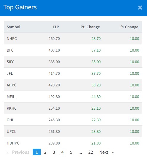 आज ३६ वटा कम्पनीको शेयर मुल्यमा सकारात्मक सर्किट लागेको छ । आज १० वटा कम्पनीको शेयर मुल्य १० प्रतिशतले बढेको छ भने २६ वटा कम्पनीको शेयर मुल्य ९ प्रतिशतभन्दा बढीले बढेको छ । आज अधिकांश कम्पनीका लगानीकर्ताले कमाएका छन् । आज डिवेञ्चर र फण्ड बाहेक सबै कम्पनीका लगानीकर्ताले कमाएका छन् ।